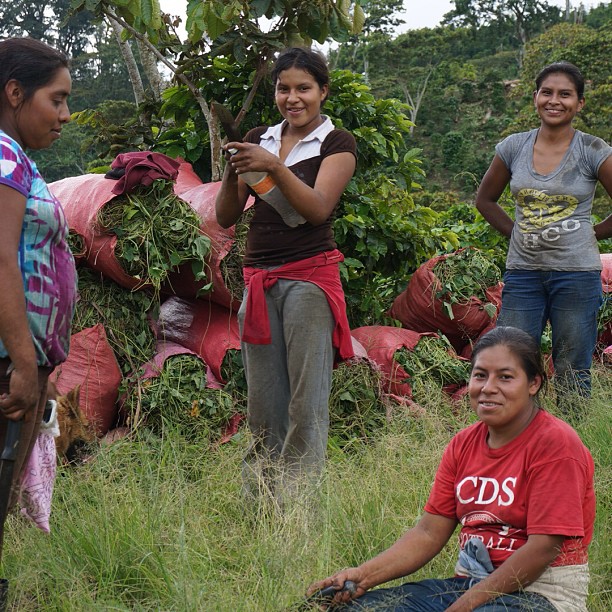 まずは、ニカラグア、カサブランカ農園。私が最も長く滞在した場所です。そこそこ大きな農園で働き手も多いですが女性も働いてますよ、という一枚。女性は女性同士のチームで仕事してました。この時どんな仕事をしてたかというとベフコといってツル状の草をみなさんで取り除いていました。このベフコ、凄まじい成長力でコーヒーの木を覆ってしまい成長を妨げます。根っこを除去しないとすぐ伸びてきちゃうので地道な手作業です。取り除いたベフコを入れた袋が後ろに見えています。何十、何百…毎日農園を少しづつ移動しながら。私も経験しましたが気の遠くなる作業でした。ですが大事な作業だと実感しました。
